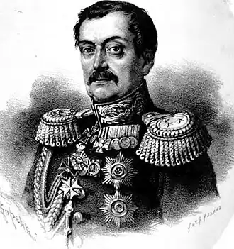 Karl Friedrich Edler[1] von Rennenkampff (Russian: Карл-Фри́дрих Па́влович Ренненка́мпф, Karl-Fridrikh Pavlovich Rennenkampf; 27 November [O.S. 16] 1788 – 5 September [O.S. 25 August] 1848) was a Baltic German statesman and general of the Imperial Russian Army. Like many other soldiers at the time, Rennenkampff participated in the Russian Campaign in 1812 against Napoleon, distinguishing him during the war including the Bautzen, along his cousin[2][3] Paul, who also participated in the Battle of Bautzen. He also served as the vice-director of the Imperial Military Academy form 1843 until his death in 1848. He was the great-uncle of the famous World War I general Paul von Rennenkampf.