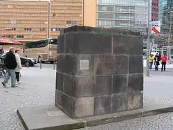 At the site of the 1916 antiwar demonstration, Friedrich Ebert Jr., Lord Mayor of Greater Berlin (East) and member of the Politburo of the Socialist Unity Party of Germany (East German Communist Party), unveiled the cornerstone of a monument to Karl Liebknecht on 13 August 1951, the 80th anniversary of his birth. The tribute took place within the framework of the Third World-Festival of Youth and Students and was part of a campaign against the rearmament of the Federal Republic of Germany (West Germany). But the memorial on Potsdamer Platz was not completed before the erection of the Berlin Wall.