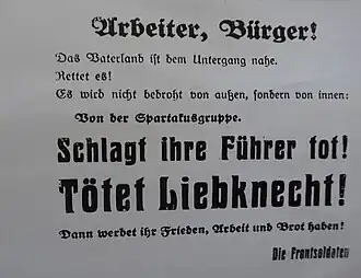 The "intelligence services of numerous 'associations representing the interests of the state'" actively sought the leading figures of the KPD.[36] In December 1918 numerous red, large-format posters directed against the Spartacus League were posted in Berlin, culminating in the demand "Beat their leaders to death! Kill Liebknecht!"[37] Hundreds of thousands of handbills with the same content were also distributed.[38] Eduard Stadtler's Anti-Bolshevik League was among those involved. In the SPD's newspaper Vorwärts (Forward), Liebknecht was repeatedly portrayed as "mentally ill".[39] The entire Council of People's Deputies signed a leaflet on 8 January announcing that "the hour of reckoning is approaching".[40] The following day the leaflet's text appeared as official news in the Deutscher Reichsanzeiger, the German Reich's newspaper of record. Rumors circulated among civilians and military personnel – spread by, among others, Philipp Scheidemann's son-in-law Fritz Henck – that bounties had been placed on the Spartacist leaders.[41] On 14 January an article appeared in a newsletter of two Social Democratic regiments, stating that "the next few days" would show that "as for the heads of the movement … the gloves are now coming off".[42]