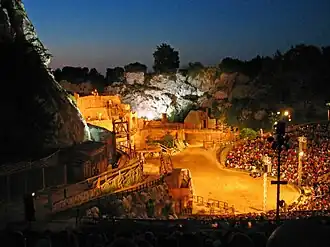 The 'Karl May Festival' (German: Karl-May-Spiele Bad Segeberg,') is a theatre festival in Bad Segeberg, Schleswig-Holstein, Germany. The festival has been held annually since 1952 and, since that year, Karl May's adventure novels about the Wild West have been put on stage as part of Karl May Festival in the Kalkberg Stadium at the scenic Segeberger Kalkberg.