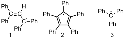 While still a doctoral student at University of Marburg, Ziegler published his first major article which showed how halochromic (R3C+Z−) salts could be made from carbinols. Previous work had left the impression that halochromic salts or free radicals (R3C•) required R to be aromatic. He was encouraged to try to synthesize similarly substituted free radicals, and successfully prepared 1,2,4,5-tetraphenylallyl in 1923 and pentaphenylcyclopentadienyl in 1925. These two compounds were much more stable than previous tri-valent carbon free radicals, such as triphenylmethyl. His interest in the stability of tri-valent carbon free-radical compounds brought him to publish the first of many publications in which he sought to identify the steric and electronic factors responsible for the dissociation of hexa-substituted ethane derivatives.[13]