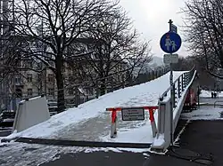 The Karlssteg is a 136.5 meter long footbridge of tension construction in Freiburg im Breisgau, Germany. A concrete strip only 25 cm thick with 60 continuous tension elements leads from Karlsplatz to the Stadtgarten. In high temperatures, the tension band can sag up to 40 cm. Construction of the bridge began in 1969; in January 1970, the columns were already standing, and in June, for the city's 850th anniversary, the Karlssteg Bridge – constructed by the engineer H.Nehse – was opened to traffic as the first bridge of its kind in Germany. In the same year, the Mozart, Hermann and Schwabentor bridges were opened, though in a less spectacular way, passing over Mozartstraße (Mozart Street) and Schlossbergring.