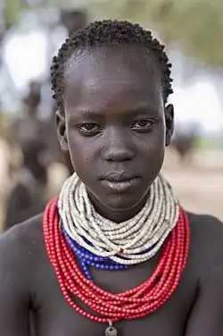 Karo[2] (also Cherre, Kere, Kerre, Kara) is a South Omotic[3] language spoken in the Debub (South) Omo Zone of the Southern Nations, Nationalities, and People's Region in Ethiopia. Karo is described as being closely related to its neighbor, Hamer-Banna, with a lexical similarity of 81%,[1] and is considered a dialect of Hamer by Blench (2006),[4] but as a separate language belonging to the Hamer-Karo subfamily in Glottolog. The Karo people, who live close to the lower Omo River, use colorful bodywork, complex headdresses and body scars to express beauty and importance within the community. 2,400 speakers are using the Karo language.