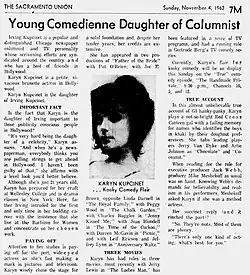 Karyn Kupcinet was born Roberta Lynn Kupcinet in Chicago, Illinois, to Irv Kupcinet, then a sportswriter for the Chicago Daily Times, and his wife, Esther Kupcinet (née Solomon). Her younger brother, Jerry Kupcinet, became, after her death, a director and producer of syndicated television shows. They were of Russian-Jewish ancestry.[1] Roberta Lynn acquired the nickname "Cookie" during her childhood, and eventually chose Karyn as a stage name. She made her acting debut at age 13 in the Chicago production of Anniversary Waltz. By then, her father had transitioned from sportswriter to entertainment columnist and host, since 1953, of the 15-minute television talk show Kup’s Corner on (channel 2). She attended Pine Manor College in Massachusetts for a semester, eventually studying at the Actors Studio in New York City.[2]