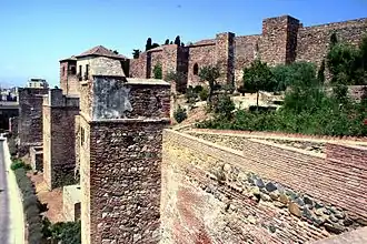 The term qasaba was historically flexible but it essentially denotes a fortress, commonly a citadel that protects a city or settlement area, or that serves as the administrative center.[7]: 228 [8]: 122 [9]: 282 [4] A kasbah citadel typically housed the military garrison and other privileged buildings such as a palace, along with other amenities such as a mosque and a hammam (bathhouse).[8]: 147 [9]: 135 Some kasbahs are built in a strategic elevated position overlooking the city, like the Kasbah of the Oudayas in Rabat, Morocco, or the Alcazaba of Málaga in Spain.[9]: 135 [7] It could also be a large purpose-built royal quarter, protected by its own set of walls, that housed the palace of the ruler and the administration of the state. Examples of this include the Kasbah of Marrakesh and the Kasbah of Tunis, both founded by the Almohads, who built or redeveloped similar palace enclosures in many important cities of their empire.[9]: 141 [10][8]: 195–197 In some cases, kasbahs could be simple fortified enclosures around a city that housed military garrisons, without being the main citadel. In Fez, for example, there were up to 13 kasbahs built throughout the city in different periods, including the Kasbah an-Nouar and the Kasbah Cherarda.[11][12]