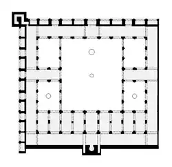 The mosque is roughly square in plan.[3] The floor plan of the mosque is notable for being dominated by the size of its courtyard and for the division of the courtyard into five parts: a large central rectangular courtyard and four minor rectangular courtyards at its corners. The four smaller courtyards are placed in two symmetrical pairs around the main courtyard: two on the west side, two on the east, and separated from the main courtyard by an arcade of arches. The large roofless space formed by these five courtyards is surrounded by the indoor prayer hall on one side (to the south) and by a roofed gallery running along the other three sides. The space between each pair of auxiliary courtyards is taken up by a narrow roofed aisle as well – essentially projections of the surrounding gallery. The main courtyard features two fountains: one in the center and a larger one closer to the northern entrance. The two secondary courtyards that are closest to the prayer hall each feature their own central fountain as well.[7] As in other mosques, these fountains serve for ablutions before prayer.