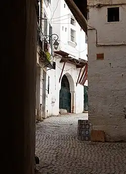 The urban layout of the Casbah of Algiers is characteristic of Maghrebian Arab-Berber medinas. The later Ottoman influence is mainly seen in military architecture, particularly in the citadel overlooking the city.[4] Originally, the term "Casbah" referred solely to this citadel before it was extended to encompass the entire medina, defined by the fortifications built during the Regency of Algiers in the 16th century.[4] The Casbah of Algiers presents a complex and mysterious urban fabric, particularly intriguing to Orientalist painters. The city's natural topography explains its winding streets, true labyrinths characteristic of the old city, as it occupies a hilly site facing the sea. According to architect Ravéreau, "the site creates the city", while Le Corbusier observes that houses and terraces are oriented toward the sea, a source of both fortune and misfortune (shipwrecks, missing sailors). The old city is fundamentally oriented towards the Mediterranean and turns its back on the hinterland. It is severed from direct sea access during colonization due to the construction of coastal boulevards.[42] The very narrow alleys sometimes lead to dead ends or vaulted passageways known as sabat.[4][43] Donkeys are among the few animals capable of navigating the entire Casbah, and since the era of the Regency of Algiers, they have been used for garbage collection.[44] Alongside the dense network of traditional alleyways, colonial-era roads like "Rue d'Isly" and "Rue de la Lyre" penetrate the Casbah.[45]