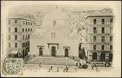 The French army enters Algiers on July 5, 1830. French presence drastically changes the city's appearance and its medina. The French transform the city by demolishing a large part of the lower Casbah and building what is now "Place des Martyrs."[30] Originally extending to the sea, the Casbah is pushed into the background by the new waterfront with its arcaded architecture. Colonization also introduces new roads that surround and penetrate the Casbah. Architecturally, the French introduce the Haussmannian style and demolish the old city's walls.[31]