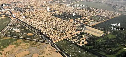 - ^ Gaston Deverdun argued that the expansion ordered by Abu Ya'qub Yusuf in 1183 corresponds to the more modest addition of a new neighbourhood in the southwest corner of the old city at Bab ash-Shari'a, where the present-day Tomb of Imam as-Suhayli stands.[7] Citing other historical sources, he gives the year 1185 as the start of the Kasbah's construction and 1190 as the approximate date of its completion, attributing the decision to create the Kasbah entirely to Ya'qub al-Mansur.[8] This chronology of events is repeated by some authors including Hamid Triki, Quentin Wilbaux, and Xavier Salmon.[9][10][11]