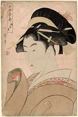 Kitagawa Utamaro (c. 1753–1806) made his name in the 1790s with his bijin ōkubi-e ("large-headed pictures of beautiful women") portraits, focusing on the head and upper torso, a style others had previously employed in portraits of kabuki actors.[4] Utamaro experimented with line, colour, and printing techniques to bring out subtle differences in the features, expressions, and backdrops of subjects from a wide variety of class and background. Utamaro's individuated beauties were in sharp contrast to the stereotyped, idealized images that had been the norm.[5]