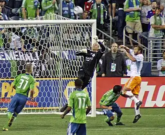 In the 2010 season, the 40-year-old Keller was the only Sounders FC player to have started every league match (32) in regular season and playoffs, logging a total of 3585 in all competitions.[16] On 27 June, he recorded a season-high nine saves in a 1–3 loss to Philadelphia Union, and three days later, he made two stops in a penalty shootout against Portland Timbers in the round of 16 of the 2010 U.S. Open Cup.[16] On 8 August, Keller recorded his first MLS assist with a long pass to Fredy Montero's opening goal in an eventual 2–0 win over Houston Dynamo, thus becoming the first Sounders goalkeeper to show up on the score sheet, and at the age of 40, one of the oldest player to register a goal contribution in MLS history.[16][17] On 9 September, Keller saved a first-half penalty in a goalless draw with Real Salt Lake.[18] On 5 October, Keller won his second U.S. Open Cup title after helping his side beat Columbus Crew 2–1 in the final in front of 31,311, the largest crowd to witness a US Open Cup final; Seattle thus become the first MLS club to successfully defend the Open Cup title and the first club overall to repeat since the New York Pancyprian-Freedoms did so in 1982 and 1983.[19] He ended the 2010 season with 11 clean-sheets, thus surpassing his 2009 total. He won MLS Save of the Year for his stop against Kansas City Wizards on 17 April and six of his 82 saves were voted MLS Save of the Week.[16]
