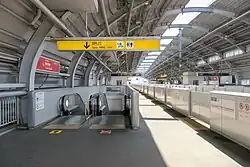 The station consists of two opposed elevated side platforms with the station building located underneath. The station building was designed by architect Makoto Sei Watanabe.