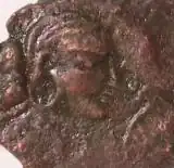 2) Kidara. Kidarite coins in the hoard comprise the majority of unpublished specimens. The obverse of some varieties closely resemble, or are crudely rendered versions of, known Kidarite drachms. The busts portrayed on these coins are depicted wearing headdresses associated with particular Kidara princes, often in turn borrowed from contemporary Sassanian / Kushano-Sassanian monarchs. This group also includes thin AE units featuring bearded busts occasionally with Brahmi legends. As they are notably different from other recorded Kushano-Sassanian bronzes, they may be attributed to Kidarite governors or princes under Kushano-Sassanian or Sassanian sovereignty.[5]