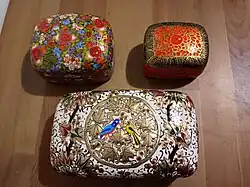 Kashmiri papier-mâché is a handicraft of Kashmir that was brought by Muslim saint Mir Sayyid Ali Hamadani from Persia in the 14th century to Kashmir. It is based primarily on paper pulp, and is a richly decorated, colourful artifact; generally in the form of vases, bowls, or cups (with and without metal rims), boxes, trays, bases of lamps, and many other small objects. These are made in homes, and workshops, in Srinagar, and other parts of the Kashmir Valley, and are marketed primarily within India, although there is a significant international market.[1][2][3] The product is protected under the Geographic Indication Act 1999 of the Government of India, and was registered by the Controller General of Patents Designs and Trademarks during the period from April 2011 to March 2012 under the title "Kashmir Paper Machie".[4]