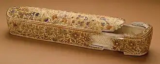 The papier-mâché technique of using paper pulp for making decorative objects was first brought to Kashmir in the 14th century by Mir Sayyid Ali Hamadani, a Sufi mystic, who arrived to Kashmir along with his followers, many of whom were craftsmen. These craftsmen used hand-made paper pulp from Iran and Central Asia.[2] The leader of the craftsmen, Mir Syed Ali Hamdani, was also instrumental in converting the people of Kashmir to Islam.[3] These artists who were also well-versed in other handicrafts such as woodcarving, copper engraving and carpet weaving made Kashmir their permanent home.[3] Another story posits that the art was brought to Kashmir in the 15th century by a local prince who had previously been imprisoned in Samarkand for many years.[6]