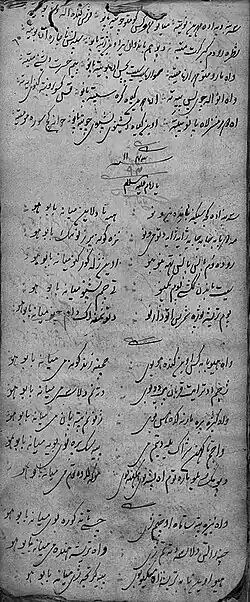 According to Hakim Ghulam Safdar Hamdani, Kashmiri marsiya evolved from a native tradition used to mourn the death of a family member, known as vān (وان).[14][7] Expressed in the vernacular, vān in its original form does not assume a poetic structure, nor does it seem to have been consigned to text.[3][45] This is a view generally held by most writers who have looked into the evolution of marsiya.[3][6][5][14][27] The arrival of Muslim preachers in Kashmir during the fourteenth and fifteenth centuries resulted in the gradual introduction of practices and traditions prevalent in the Islamic world into Kashmiri society, including that of marsiya.[7] A surviving marsiya from this period starts with a verse in Persian followed by its translation in Kashmiri in the same meter.[4][19]