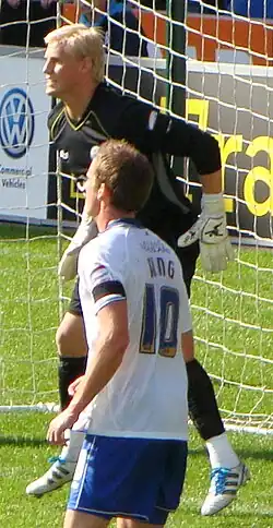 A fine string of performances in October earned Schmeichel the Player of the Month award.[43] During Schmeichel's stay at The Magpies, the club conceded only 0.67 goals per League Two match (29 goals conceded in 43 league appearances). Schmeichel's clean-sheets-to-game-ratio at Notts County was an impressive 55.8 percent (24 out of 43 league appearances).[44] On 27 April, Schmeichel and Notts County secured the 2009–10 League Two title and promotion to League One with a 5–0 win against already relegated Darlington.[45][46] Shortly before the game, it was announced that Notts County agreed to release Schmeichel at the end of the season, despite having four years left on his contract. The reasoning behind this was financial: Schmeichel earned a reported £15,000 per week, having been signed during the brief ownership period of high-spending Munto Finance in the summer 2009. Schmeichel agreed to forgo all his future wages, something which chairman Ray Trew described as "a huge concession by such a young man".[47]