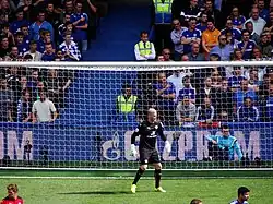 In the first month of the season, Schmeichel was shown a seemingly needless red card in the 79th minute of Leicester's away game to Nottingham Forest on 20 August 2011 after receiving two yellow cards for "unsporting conduct". He received the first card for moving the ball from the penalty spot as Forest's Lewis McGugan was about to take a kick, then received his second for throwing the ball away after the spot kick was successfully converted. After the match, Schmeichel apologized, claiming his back was turned to the referee so did not know he had received the first of the yellow cards. "I didn't know I had been booked as I had my back to the ref otherwise I would never have done that," he said on his personal Twitter page.[63][64] Despite this, Schmeichel's performances for Leicester quickly began earning him plaudits, with his then manager Sven-Göran Eriksson comparing him with England number 1 goalkeeper Joe Hart,[65] and teammate and former England international Paul Konchesky describing him as "one of the best [goalkeepers] he has ever played with".[66] A short-distant reaction save against Portsmouth in November 2011, in particular, earned Schmeichel praise and was described by Portsmouth manager Michael Appleton as "one of the best saves I have seen in a very long time".[67] and by Leicester manager Nigel Pearson as "a world-class, outstanding save and was very important at that point of the game".[68]