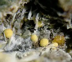 Kassite is a rare mineral whose chemical formula is CaTi2O4(OH)2. It crystallizes in the orthorhombic crystal system and forms radiating rosettes and pseudo-hexagonal tabular crystals which are commonly twinned. Kassite crystals are brownish pink to pale yellow in color, are translucent, and have an adamantine luster. Cleavage is distinctly visible, and the crystals are very brittle.
