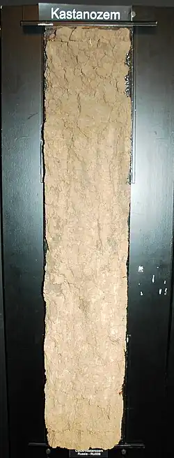 Kastanozem (also known as "chestnut soil") is one of the 32 Reference Soil Groups of the World Reference Base for Soil Resources (WRB). These soils are brighter than Chernozems, and are related to the Mollisols in the USDA soil taxonomy. They are rich in humus, and originally covered with early maturing native grasslands vegetation, which produces a characteristic brown surface layer in the first meter in depth. They have a relative high level of exchangeable calcium ions and secondary carbonates starting within 70 cm of the mineral soil surface.