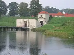 The Citadel has two gates, King's Gate on the south side, facing the city, and Norway Gate on the north side of the edifice, which both date from 1663 as part of Ruise's original citadel. They are built in the Dutch Baroque style, and are on their interior side flanked by guardhouses. The King's Gate is decorated with garlands and pilasters, and a bust of King Frederik III. The clock and two bells on the interior facade of the gate come from the Central Guard House at Kongens Nytorv and were installed in 1874 when the central guard moved to the Citadel. In front of the gate stand two so-called caponiers from where it was possible to keep assaulting troops under fire. The Norway Gate used to face open countryside outside the city, and has therefore been built to a more simple design. The caponiers of this gate were demolished in the late 19th century.
