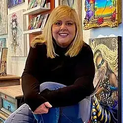 She studied at the University of Nevada, Las Vegas and participated in art workshops around the country.[2] Her media include oil, acrylic, colored pencil, and mixed media sculpture. A distinguishing feature of her work is the use of antique or historic frames, often integrated into the artwork's narrative.[2]