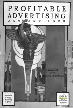 Profitable Advertising absorbed Charles Austin Bates' Current Advertising, together with Returns, of San Francisco, and opened a New York City office besides the Boston office on Nassau Street.[2] Of more than 200 advertising publications that were launched at various times during the years 1888–1903, approximately 30 continued to publish and were listed in the American Newspaper Directory. She became the owner of Profitable Advertising in 1895. Founded as an organ for the C. F. David advertising agency in 1891, it ran indifferently for a year, when Griswold took editorial charge. There was not much of a foundation for a successful periodical when the agency went out of existence in 1895, but Griswold she put the publication upon an independent editorial and business basis, and maintained the journal on that basis thereafter, gradually evolving a successful monthly that was circulated upon its merits and filled a very tangible need in the advertising world. Where advertisers take two trade journals those two are pretty certain to be Profitable Advertising and George P. Rowell's Printers' Ink.[5]
