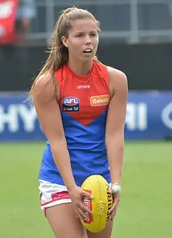 Kate Hore (born 25 March 1995) is an Australian rules footballer playing for the Melbourne Football Club in the AFL Women's (AFLW). Hore was recruited by Melbourne as a rookie signing in May 2017.[1] She made her debut in the six point win against Greater Western Sydney at Casey Fields in the opening round of the 2018 season.[2] The 2020 AFL Women's season saw Hore obtain her first AFL Women's All-Australian team selection, named in the full forward position.[3][4]