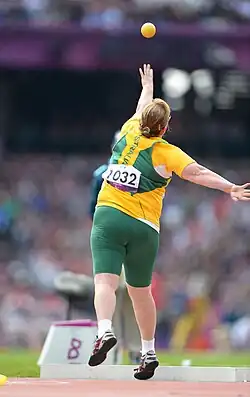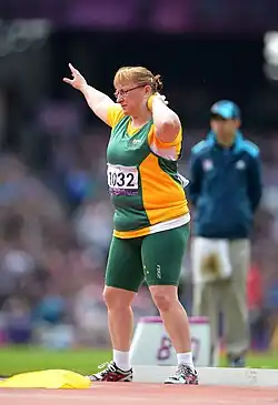 Katherine Proudfoot (born 21 April 1977 in Auckland, New Zealand)[1] is a cerebral palsy athlete from Australia competing mainly in throwing events.[1] She competed in the F36 classification at the 2008, 2012 and the 2016 Summer Paralympics, winning medals at each Game.[2][3] Following a medical review request in early 2017, she now competes in seated throws in the F32 classification.[4] At the 2017 Australian Athletics Championships she threw 7.04m in the Women's Shot Put Secured event, bettering the Women's F32 shot put world record mark of 6.55m.[5]