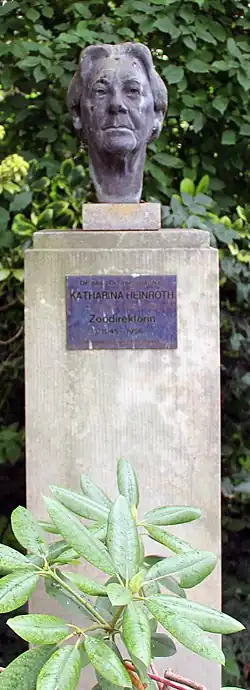 Katharina Berger was born among four siblings in Breslau. As a child she grew up in the village of Wohwitz west of Breslau where she kept frogs and other animals at home, observing the growth of butterflies. She later noted that this was significant in deciding her future interests and career. She went to the secondary lyceum in Breslau followed by studies in zoology, botany and geology at Munich. She graduated in 1923 summa cum laude with work on hearing in reptiles under Otto Köhler. She moved to Munich in 1925 where she lived with Gustav Adolf Rösch, an assistant to Karl von Frisch. She too worked with Frisch on bees and Breslau. She married Rösch in 1928 but they divorced in a few years. She then moved to Halle and worked at the Leopoldina Academy library. She then moved to Berlin where she married Oskar Heinroth in 1933. When he died in 1945 and with the escape of the earlier Nazi director, Lutz Heck (whose father Ludwig Heck had also worked in the Berlin zoo), she was given charge as scientific director of the Berlin zoo and helped restore it from the damages of war. Of the 4000 animals in the zoo, only 91 remained at the end of the war. She earned the nickname of "Katharina die Einzige" ("the one and only Katharina"). She specialized in animal behaviour and was especially skilled in raising birds. From 1953, she also lectured on zoology at Technische Universität Berlin.[1][2][3]