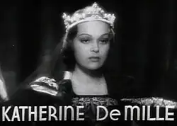 The role of Princess Alice of France in The Crusades (1935) was a Christmas gift from her father, Cecil B. DeMille. Andre Sennwald of The New York Times wrote that the actors who gave "excellent performances" in the film included "that striking brunette, Katherine De Mille."[9] Hollywood also praised DeMille, who was "splendid as the jilted Princess Alice of France."[10]
