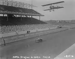 Stinson began exhibition flying and became known as the "Flying Schoolgirl" and "America's Sweetheart of the Air."[12] On July 18, 1915, at Cicero Field in Chicago, Illinois, Stinson performed an inside loop (a year after Lydia Zvereva became the first woman aviator to do so[13]), and went on to perform this feat some 500 times without a single accident.[14] She also became one of the first pilots to ever fly at night.[9] Adding to her night flying experience, she flew over Los Angeles with flares attached to the plane and--according to local newspapers--spelled out "CAL," becoming the first nighttime skywriter.[9] In another publicity stunt on May 6, 1916, Stinson flew her plane in a race with Dario Resta, the 1916 Indianapolis 500 champion.