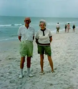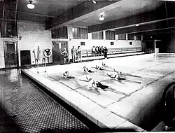 Kay Curtis introduced synchronized swimming in 1934 at the Chicago World's Fair with Norman Ross as her announcer.[2] To her, synchronized swimming was a co-ed sport as it still might be if she had not been transferred overseas (1943–1962) with the Red Cross as recreational director. One of her early disciples was International Swimming Federation President, Dr. Hal W. Henning.[3] She staged a production for the Armed Forces in the spectacular fountains and pools and gardens of the palace built by the Kings of the Two Sicilys and used as Allied headquarters in Caserta, Italy. When she finally returned home in 1962 after observing synchronized swimming all over Europe, her baby was a full-blown sport and has been a dominant American aquatic sport and art form ever since. Her pioneer book Rhythmic Swimming (1936) was a classic textbook on the sport she originated.[4] Her no-nonsense ability to say it like it is made her not only the tough mother of synchronized swimming but led Bill Bachrach to call Kay Curtis "the only person I was ever jealous of in swimming".[5]