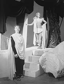 In the remaining wartime months, Ferrier continued to travel throughout the country, to fulfil the growing demands for her services from concert promoters. At Leeds in November 1944, she sang the part of the Angel in Elgar's choral work The Dream of Gerontius, her first performance in what became one of her best-known roles.[40] In December she met John Barbirolli while working on another Elgar piece, Sea Pictures; the conductor later became one of her closest friends and strongest advocates.[41] On 15 September 1945, Ferrier made her debut at the London Proms, when she sang L'Air des Adieux from Tchaikovsky's opera The Maid of Orleans.[42][43] Although she often sang individual arias, opera was not Ferrier's natural forte; she had not enjoyed singing the title role in a concert version of Bizet's Carmen at Stourbridge in March 1944, and generally avoided similar engagements.[44] Nevertheless, Benjamin Britten, who had heard her Westminster Abbey Messiah performance, persuaded her to create the role of Lucretia in his new opera The Rape of Lucretia, which was to open the first postwar Glyndebourne Festival in 1946. She would share the part with Nancy Evans.[45] Despite her initial misgivings, by early July Ferrier was writing to her agent that she was "enjoying [the rehearsals] tremendously and I should think it's the best part one could possibly have".[46]