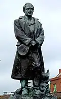 During World War I, Scott initially set aside sculpture and worked in a variety of other roles to support the British and Allied war effort. She helped to set up an ambulance service for the French army by transporting vehicles to northern France and raised money and recruited volunteers to support the establishment of Hôpital Temporaire d'Arc-en-Barrois at the Chateau d'Arc-en-Barrois where she subsequently worked for a time.[1] Scott then worked on the assembly benches of a Vickers electronics factory at Erith in south London.[1] In England she also worked on three statues connected with the Terra Nova expedition.[9] The first to be commissioned, by the mayor of Cheltenham, was her statue of Edward Wilson which was unveiled in July 1914.[9] Her statue of Scott in his naval greatcoat with a husky at his feet was commissioned by officers of the Portsmouth naval base and dockyards and was unveiled in February 1915.[9] Her bronze statue of Captain Scott was unveiled in central London in November 1915, although Scott did not attend the ceremony and spent the day at the Vickers factory.[9] In March 1916 Scott travelled, via Paris and Rome, to the quarry in Carrara, Italy where she carved the white marble Statue of Captain Robert Falcon Scott which was erected at Christchurch Central City, New Zealand, in 1917.[1] In 1917, Scott served as a private secretary to Sir Matthew Nathan in the Ministry of Pensions.[2] She resigned that post towards the end of 1917 but resumed working for the Ministry in Paris for a short while.[1]