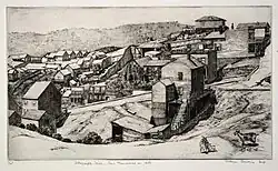 Cawein's early work earned awards. Her 1934 etching "South Window" (shown at left) appeared in a juried show called the International Exhibition of Contemporary Prints, held at the Art Institute of Chicago in conjunction with the Chicago World's Fair.[12] In 1936 her drypoint, "Telegraph Hill, San Francisco, in 1869" (shown at right) won the Frederick Talcott Prize, an award given annually by the Society of American Etchers for the best print by a non-member to be shown at its annual exhibition.[21] In 1944 her drypoint sketch, "Uncle Clarence's Barn, Fairfield, N.Y." received honorable mention in the annual exhibition put on by the National Association of Women Artists.[22] In 1947 an etching of Cawein's won an award at the 55th Annual Exhibition of the National Association of Women Artists.[4]