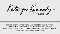 Kathryn Kennedy Winery is a small winery located in Saratoga, California. It is located on 7 acres (2.8 ha) of land in the foothills of the Santa Cruz Mountains near Silicon Valley. Kathryn Kennedy Winery produces Cabernet Sauvignon, Syrah, Sauvignon blanc, and a Lateral blend.[2]