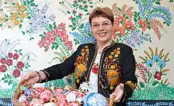 The final form of art she learned was glass painting (including icons) - her first major work in this field was the decoration of the cabinets at her own exhibition. But the branch of art she is fond of the most is egg painting. She decided to involve herself in this art after she got to enjoy the motives (including flowers) and colors of wall painting.[15] Since then, she is spreader and teacher of Hungarian folk art.[16]