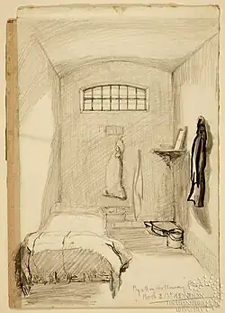 In March 1912 she smashed the window of a Post Office in Wimpole Street and was arrested and sentenced to two months imprisonment with hard labour in Holloway Prison[7] which she served during March and April 1912.[8] Expecting to be imprisoned for her actions Gliddon had sewn pencils into the collar of her coat and used these to write and illustrate a secret prison diary in the margins of her copy of The Poetical Works of Percy Bysshe Shelley.[2] Gliddon's sentence of hard labour was sewing and she wrote in her prison diary that she deliberately sewed badly.[9]