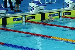 At the 2012 Summer Olympics in London, Ledecky qualified to swim in the final of the 800-meter freestyle by placing third overall in the heats with a time of 8:23.84.[34] In the final, Ledecky stunned the field, winning gold by more than four seconds, with a time of 8:14.63, the then second-fastest effort of all time just behind Rebecca Adlington's world record of 8:14.10 set in 2008.[35] In addition, she broke Janet Evans' American record of 8:16.22 that had stood since 1989. In the final, Ledecky went out hard and, by the 200-meter mark, she had already established an almost body-length lead. Her 400-meter split was 4:04.34, a personal best for Ledecky in that distance, and would have placed fifth in the individual 400-meter freestyle. At the 750-meter mark, Ledecky was 3.42 seconds ahead of Mireia Belmonte García, and 0.31 seconds under world record pace. Ledecky won by 4.13 seconds and just missed the world record by 0.53 seconds. Her gold was the first international medal of her career, earning her the 2012 Best Female Performance of the Year and Breakout Performer of the Year at the Golden Goggle Awards.