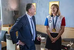 Ledecky's success has earned her Swimming World's Female World Swimmer of the Year a record five times. Ledecky was also named Associated Press Female Athlete of the Year in 2017 and 2022, international female Champion of Champions by L'Équipe in 2014 and 2017, United States Olympic Committee Female Athlete of the Year in 2013, 2016 and 2017, Sportswoman of the Year by the Women's Sports Foundation in 2017, and the ESPY Best Female Athlete in 2022.[11] In 2024, she was awarded the Presidential Medal of Freedom by President Joe Biden.[12][13]