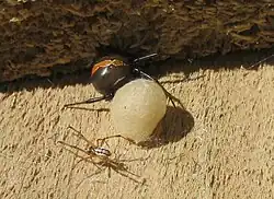 The katipō typically catches wandering ground invertebrates such as beetles (e.g. Cecyropa modesta) or amphipods (e.g. Bellorchestia quoyana), but it may occasionally catch moths, flies, and other spiders.[11][14][23] Katipō can catch insects much larger than themselves. These larger insects often become entangled in the web and in the ensuing struggle, the web's ground anchor line breaks. The silk's elasticity causes the prey to become suspended a few centimetres off the ground. The katipō then moves to the prey, turns so that the spinnerets are facing the insect and spins silk over it. Like most theridiids, the tarsi of the hind legs have a row of strong curved bristles which are arranged as a comb. The katipō uses these to scoop sticky silk from its spinnerets and throws it over the insect with a series of rapid movements.[7] After the insect is firmly immobilised, the spider bites it several times, usually at the joints, before spinning more silk to strengthen the web, and then administering a last long bite which ultimately kills the insect. The spider then moves the prey up into the web until it is ready to eat. If food is readily available then it is common to see five or six insects hanging in the web waiting to be ingested. The male's hunting behaviour is similar to the female's, although may not be as vigorous due to its smaller size.[14]