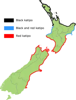 The red katipō is found south of approximately 39°15′ S (the western tip of Taranaki on the west coast, and just north of Waipatiki Beach in Hawke's Bay on the east coast). The black katipō is found north of approximately 38° S (Aotea Harbour, just north of Kawhia on the west coast, and Waipiro Bay and just south of the Bay of Plenty on the east coast). Both forms are found in the area in between these latitudes.[5]
