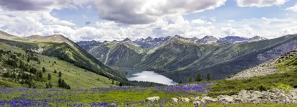 Katon-Karagay National Park (Kazakh: Катонқараға́й мемлекетті́к ұлтты́қ табиғи́ паркі́, Katonqarağai memlekettık ūlttyq tabiği parkı) is the largest national park in Kazakhstan, located on the eastern edge of the country, in the Southern Altai Mountains. The park fills the west side of the "X" where the borders of Kazakhstan, Russia, China, and Mongolia meet. The highest peak in Siberia (Belukha Mountain, 4,506 m (14,783 ft)), is on the Russian border in the Katun Range.[1] The park is in Katonkaragay District of East Kazakhstan Region, 1,000 kilometres (620 mi) southeast of the capital city of Astana.[2]