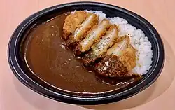 Katsu curry (Japanese: カツカレー, romanized: katsukarē) is a Japanese dish consisting of tonkatsu (pork cutlet) served with Japanese rice and curry. It is served on a large plate and is typically eaten using a spoon or fork. The cutlet is usually precut into strips, eliminating the need for a knife.
