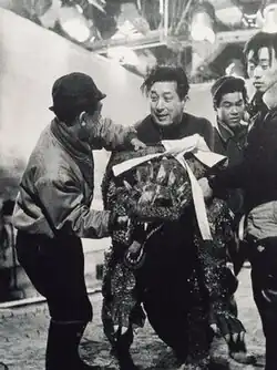 ![]() Tezuka (center) in the Anguirus suit on the set of Godzilla Raids Again, 1955 | |