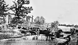 In 1845 James J. Crawford received a land grant that included this area. The hot summers and thick clay soil made it difficult to attract settlers to the area.[12] Freed slaves and their families including Thomas (Mary) Robinson and Milto McGinnis, along with Mr. Crawford, Peter Black, and John Sills were the only recorded residents of Cane Island in 1875.