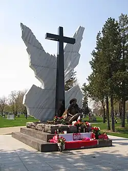 The Katyń Memorial (Polish: Pomnik Katyński) is a monument in Niles, Illinois, United States, located at the St. Adalbert Cemetery. It commemorates victims of Katyn massacre, a series of mass executions of nearly 22,000 Polish military and police officers, border guards, and intelligentsia prisoners of war carried out in 1940 by the People's Commissariat for Internal Affairs of the Soviet Union. The sculpture was designed by Wojciech Seweryn, and unveiled on May 17, 2009. The monument features a statue of keeling Mary of Nazareth, holding in her arms a dead Polish soldier, with a large granite Christian cross behind her, and a sculpture made from white stone, forming outline of a military eagle, symbol of Polish Arm Forces, with a missing head.