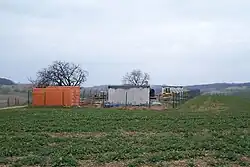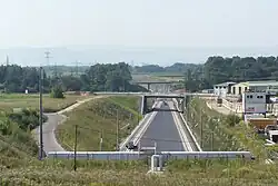 The planning approval procedure for the Schliengen–Basel section, to which the tunnel belongs, was conducted by the council of the Freiburg region from 1987 and compared the Katzenberg and the Rhine foreland options with each other. In the same year, 40 holes were sunk between Efringen-Kirchen and Schliengen to explore the subsoil. Some holes were up to 140 m deep.[16] In the planning decision of 24 February 1989, the Rhine foreland option was rejected and the Katzenberg option was preferred.[19][21] The Katzenberg option was identified as the most environmentally friendly and economical solution according to information supplied by Deutsche Bahn.[1] It was also planned to build the new line through Eimeldingen below ground level. During the construction of Autobahn 98 an abutment was built for a railway bridge. In 2002, it was finally decided not to build the line in a cutting, but to equip it with noise barriers instead, therefore, the abutments had to be demolished.[13][16]