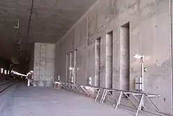 The shells of the tunnel was completed in December 2010.[12] In March 2010, the contract to equip the tunnel with slab track was awarded to Max Bögl.[38] It was installed between November 2010[38] and March 2012.[39] Installation of the slab track was largely completed in the western tunnel in October 2011 and completed in the eastern tunnel in March 2012.[40]